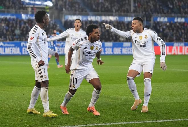 一样是2:1获胜,皇马赢得更为惊险;第24分钟,贝林厄姆斜塞反击,姆巴佩左路个人能力内切突破兜射率先完成破门,伤缺一场仍然没有阻挡住姆巴佩进球的步伐,这已经是他今年为皇马打进的第56粒进球了。阿拉维斯顽强地在第69分钟由比森特单刀完成破门,关键时刻是罗德里戈挺身而出;他在第76分钟门前包抄接到维尼修斯的左路突破低平球传中完成破门,皇马才在客场2:1惊险取胜。连续2场首发打进2球,赛季初被弃用的小罗总用2粒进球暂缓了阿隆索的下课危机。